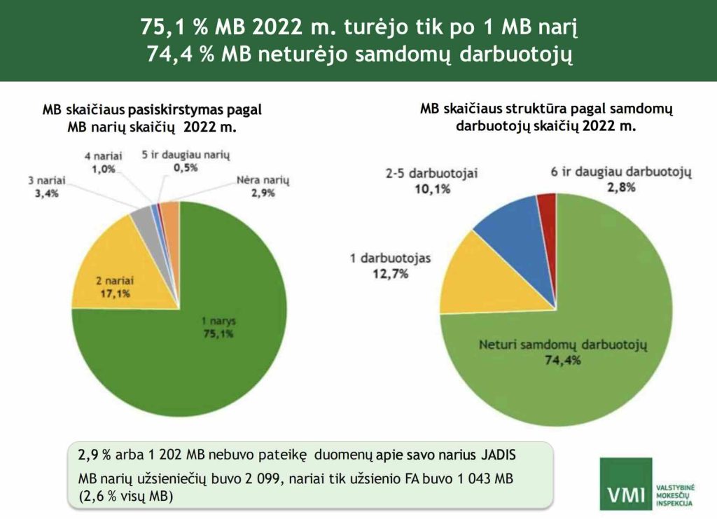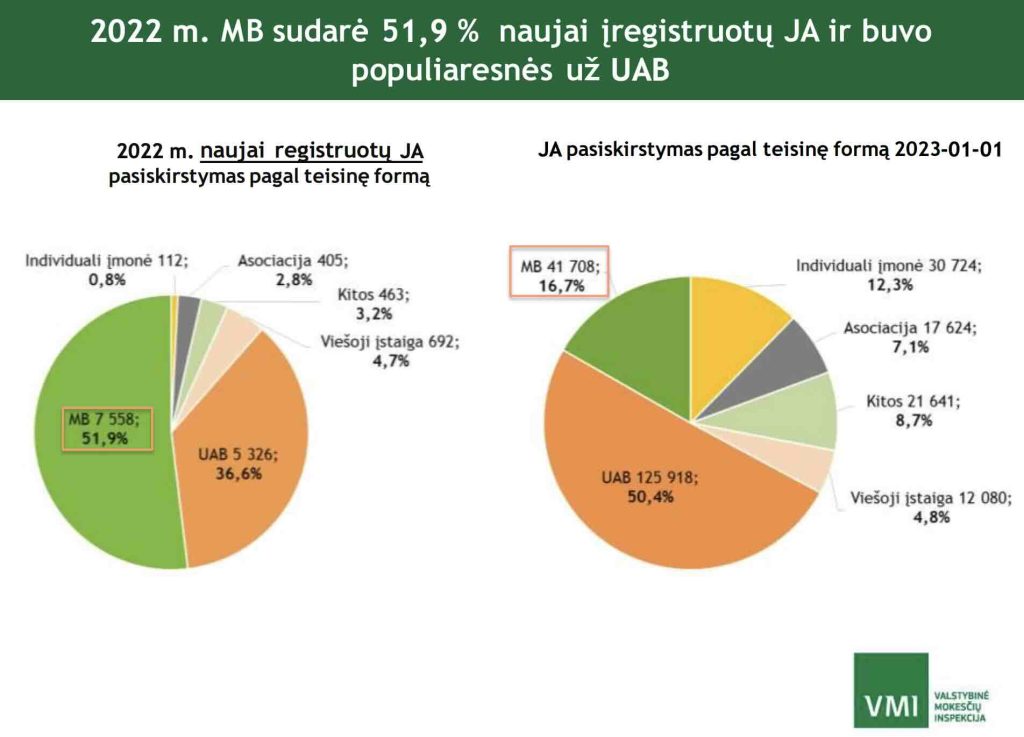 Valstybinė mokesčių inspekcija (VMI) 2023 m. paskelbtoje išsamioje „Mažųjų bendrijų veiklos analizėje“ konstatuoja, kad 2022 m. MB sudarė net 51,9 % visų naujai įregistruotų juridinių asmenų ir pagal populiarumą aplenkė UAB.