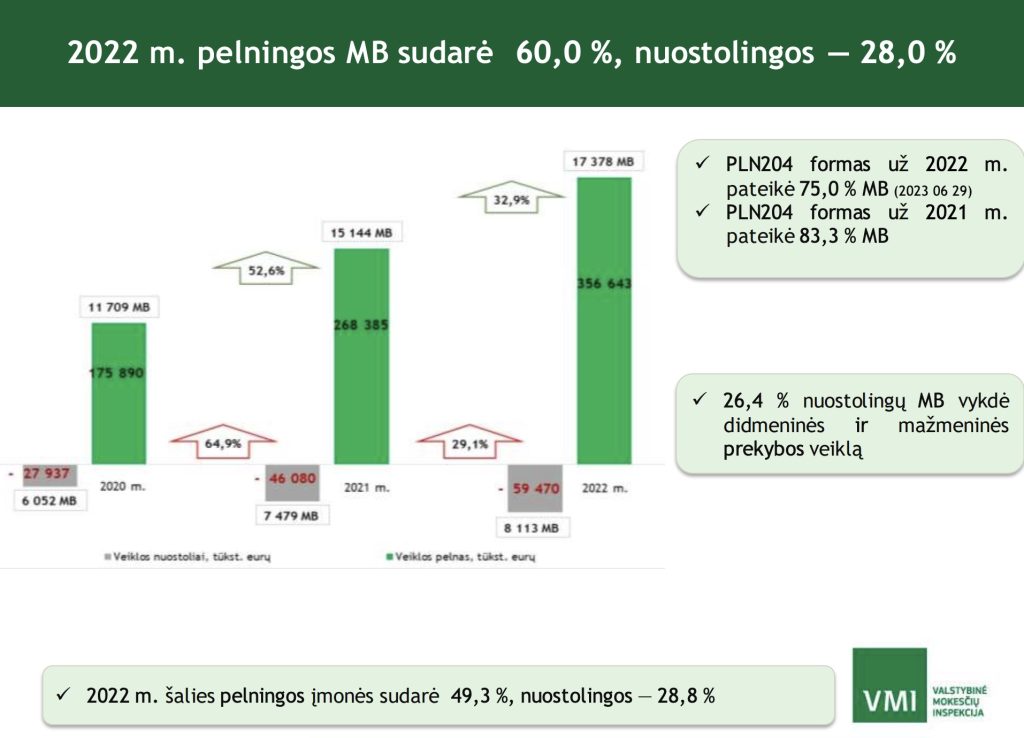 Pagal VMI analizę, 2022 m. pelningos MB sudarė 60,0 %, nuostolingos – 28,0 %. Tuo tarpu visoje šalies įmonių ekonomikoje pelningų įmonių dalis siekė 49,3 %, nuostolingų – 28,8 %.