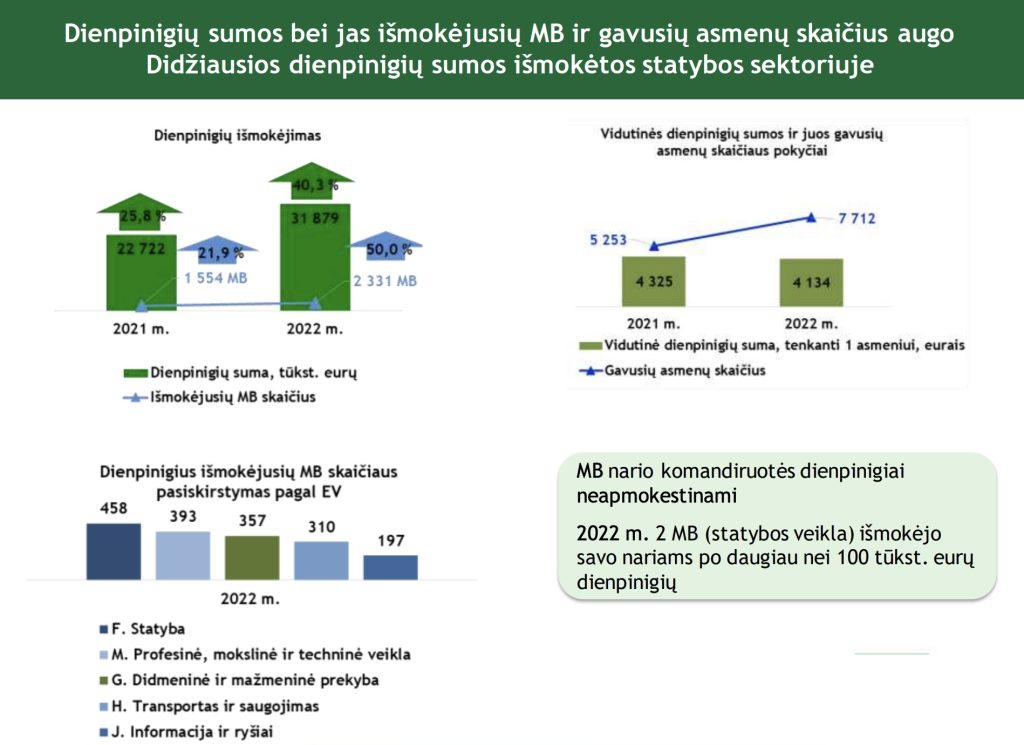 Dienpinigiai ir komandiruotės MB nario komandiruotės dienpinigiai neapmokestinami gyventojų pajamų mokesčiu, o VMI fiksuoja atvejus, kai statybos sektoriuje nariams išmokėta po daugiau nei 100 tūkst. eurų dienpinigių per metus.