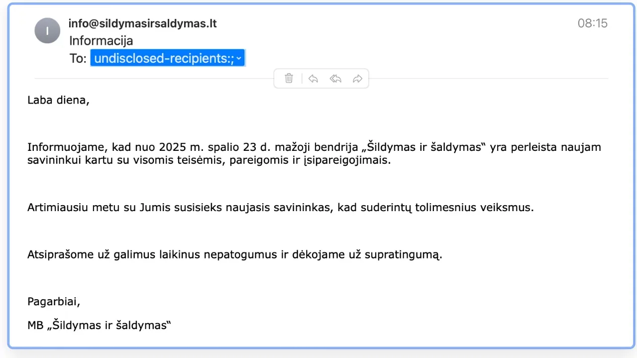 Airūnas Sabulis buvo įmonės MB „Šildymas ir šaldymas“ savininkas, kuri vertėsi kondicionierių ir šildymo katilų prekyba. 2025 m. birželį, pagal asmeninį susitarimą su Airūnu Sabuliu, į jo įmonės sąskaitą buvo pervesta 16 000 eurų už „Daikin“ šildymo katilą ir 7 kondicionierius. Po pervedimo jis nuolat perkeldavo prekių pristatymo datą, remdamasis savo užimtumu. Spalio mėnesį telefonas buvo išjungtas, o vėliau, kaip paaiškėjo, įmonė buvo parduota kartu su visomis skolomis. Prekes taip ir negautos.
