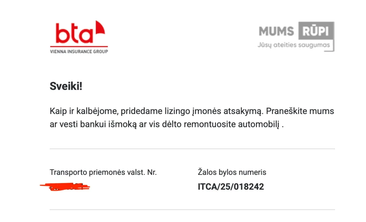 Kai paaiškėjo, kad mano automobilis yra lizinguotas, prasidėjo pasiteisinimai, kad jie pinigų man nemokės – tik bankui. Tačiau ir bankui jie nenorėjo normaliai pervesti, vis kartojo, kad reikalinga serviso sąmata remontui, nors aš buvau pasirinkęs piniginę išmoką ir jie patys buvo paskaičiavę žalos sumą, su kuria sutikau. Po kelių mėnesių tampymosi jie vis dėlto pervedė pinigus bankui, bankas paprašė sąmatos, pagal kurią buvo apskaičiuota žala… ir nuo to momento prasidėjo ignoravimas, kuris tęsiasi iki šiol. Savo pinigų taip ir nesulaukiau.